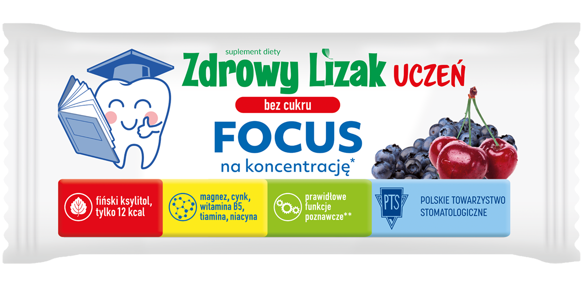 Zdrowy Lizak UCZEŃ FOCUS to nowy lizak stworzony z myślą o dzieciach w wieku szkolnym polecany do spożycia w okresie wzmożonego wysiłku umysłowego i potrzeby koncentracji. Smak: wiśnia - jagoda. Zawiera: