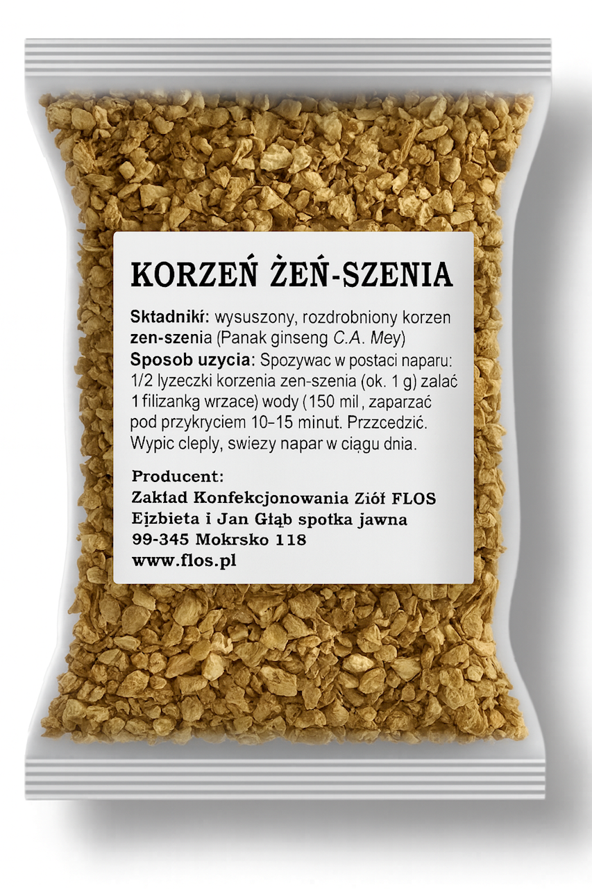 Wysuszony, rozdrobniony korzeń żeń-szenia (Panax ginseng C.A. Mey) – 100%